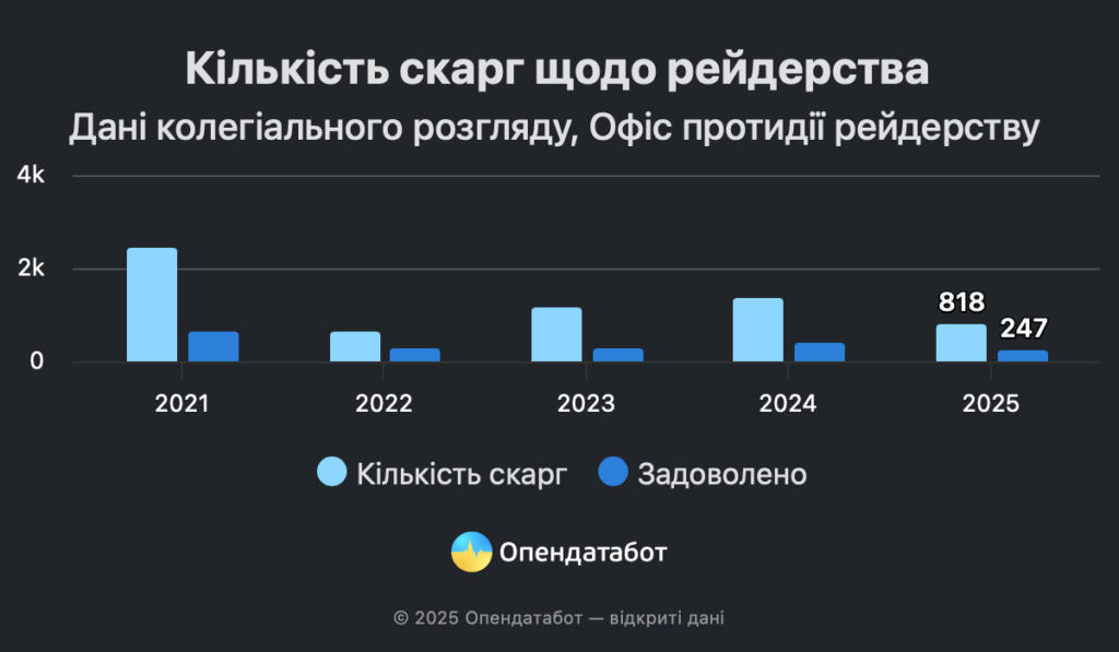 Офіс протидії рейдерству за вісім місяців 2025 року розглянув 830 звернень щодо потенційних рейдерських захоплень це на 40% менше, ніж за той самий період 2024 року. Найчастіше скарги стосувалися нерухомості:676 звернень (81%), ще 154 випадки були пов’язані з бізнесом. Аналітики зазначають: на незаконне заволодіння нерухомістю цьогоріч скаржаться на 43% менше, а ось щодо бізнесу скарг поменшало лише на 15%.