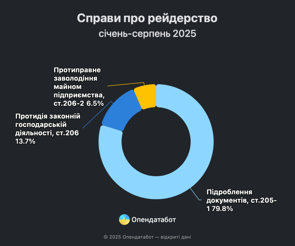 Аналітики “Опендатабот” констатують: “Абсолютна більшість проваджень це випадки підроблення документів.” Така тенденція означає, що силові чи класичні рейдерські захоплення, які супроводжувалися відкритим насильством, поступово поступаються місцем “паперовому рейдерству” через фіктивні зміни в реєстрах чи підробку майнових прав.