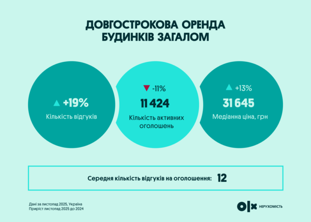 Окремої уваги заслуговує сегмент оренди приватних будинків, який став одним із найдинамічніших у 2025 році. Попит тут зріс на 19%, середня кількість відгуків на одне оголошення сягнула 12, а кількість активних пропозицій скоротилася на 11%. Це спричинило зростання медіанної вартості оренди будинків на 13% по країні. Ужгород випередив навіть Київ за рівнем орендних ставок, а найбільше річне зростання цін зафіксовано у столиці (+68%), Чернівцях (+57%) та Сумах (+43%).
