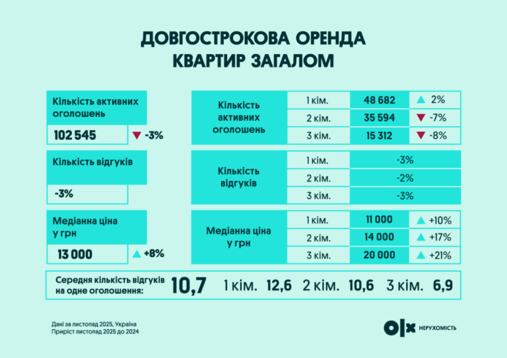 Ринок довгострокової оренди квартир у 2025 році показав ще один характерний парадокс. Попит і пропозиція зменшилися на 3%, однак медіанна вартість оренди по країні зросла на 8%. Найбільше подорожчали трикімнатні квартири одразу на 21%, що вказує на зміну формату проживання і зростання попиту на житло для сімей або спільного проживання.